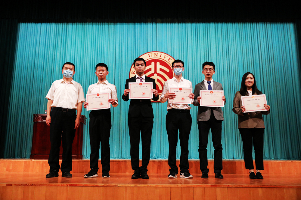 在庄严的国歌奏唱仪式后,开学典礼正式举行。首先进行了国家奖学金获奖代表表彰,党委副书记夏定国为毛诗琦、袁磊祺、黄奇正、陈策、叶帆5位奖学金获得者颁发证书,向他们表示了祝贺与鼓励。