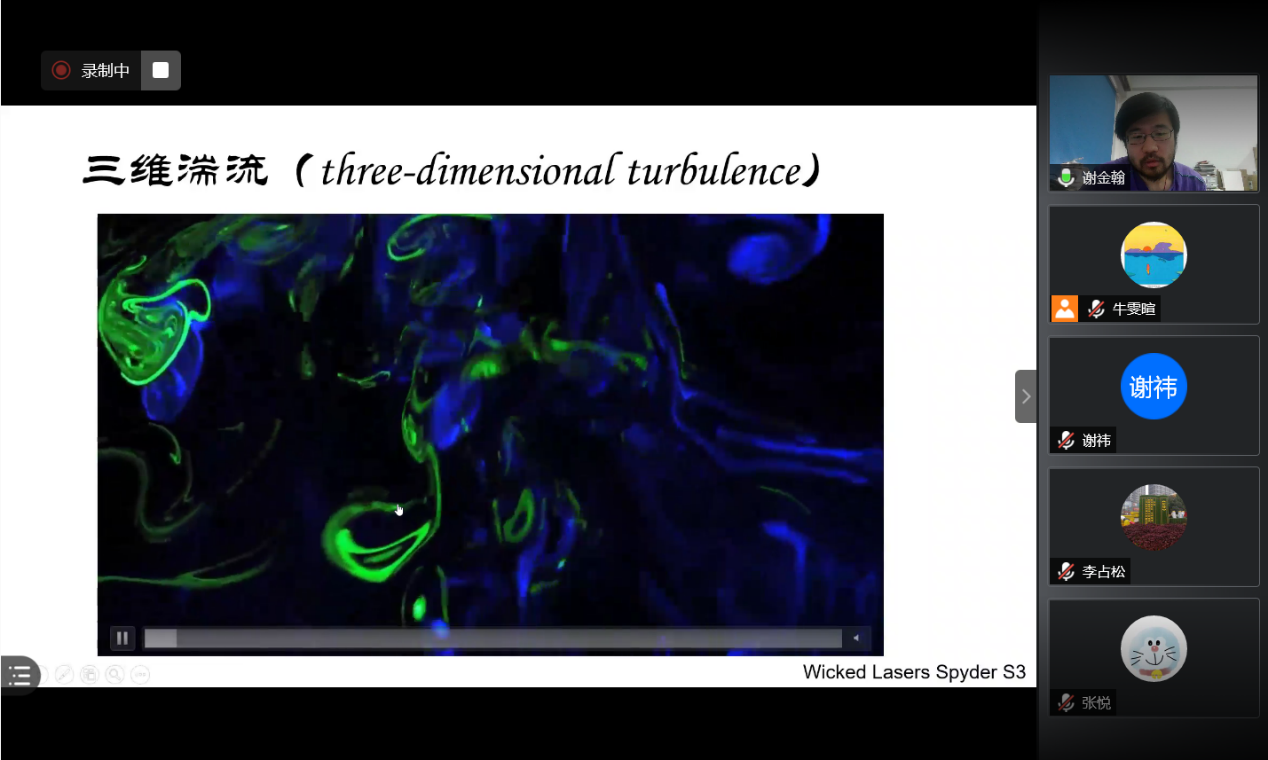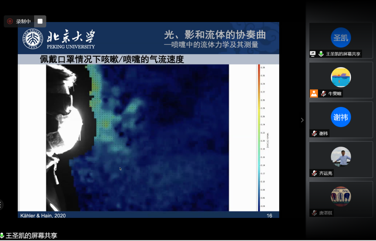 王圣凯老师以“光、影和流体力学的协奏曲——喷嚏中的流体力学及其测量”为题,讨论了日常生活中的一个与湍流相关的小问题,即喷嚏中的流体力学,并从实验的角度介绍了当代流体力学研究中若干奇妙的光学测量技术。王老师播放了在没有佩戴口罩和佩戴口罩两种情况下人们打喷嚏的动画。在流场光学测量下,我们清晰且直观的看到了其中的流体运动。当代前沿的流场光学测量方法,不仅可以帮助我们更好地观察生活中有趣的流体力学现象,对于人体呼吸检测、大气环境监测和遥感、工业过程控制等诸多方面,以及高速风洞地面测试、航空航天、太空探索等尖端领域,都有着广泛的应用潜力。与光、影和流体共舞,不仅是令人激动的科学研究,同时也是一门艺术。