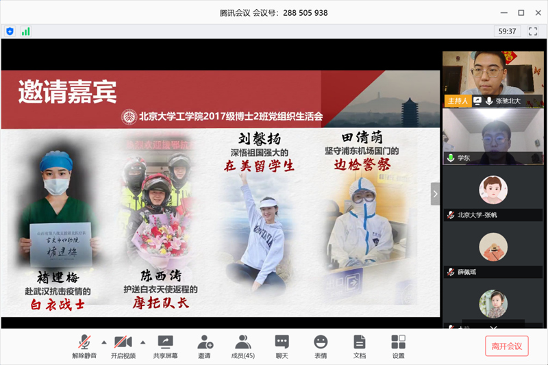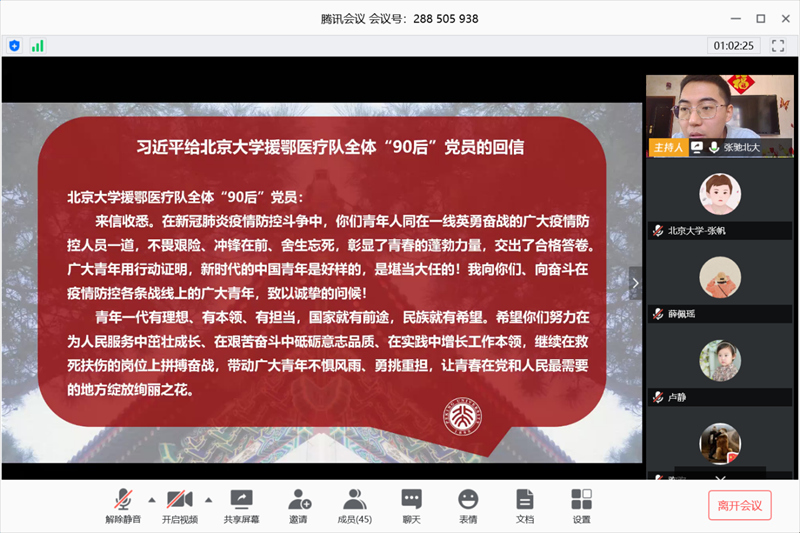结束对四位嘉宾的访谈后,参会的同志们被嘉宾们真实鲜活的抗疫故事所感动,纷纷发表感言。朱学东同学代表参会青年党员,从爱国、团结、立志三个角度出发,表达自己对嘉宾、对北大援鄂医疗队、对疫情期间所有奉献坚守同志们的感谢。