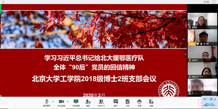 受邀出席此次会议的生医系老师们也纷纷表达了对员工党员们的期望。席建忠表示,习近平总书记在百忙之中给北大援鄂医疗队全体“90”后党员写了回信,这传递了习近平总书记对北大学子的热切关怀。医疗队的全体成员在抗击疫情的战线上做了不懈努力,令人感动,同为北大学子的生医系同学们也应当勠力同心、砥砺前行,思考如何在时代背景下将自己的专业如何发展得更好。席鹏表示,此次新冠肺炎疫情中备受关注的“核酸试剂盒”、“CT成像评估”、“病毒结构”、“基因测序”等工作都与生物医学工程专业有着密切的联系,生物医学工程专业正以前所未有姿态成为站在医生和护士背后的那个高大身影,希望同学们努力学好专业本领、为日后服务祖国人们打牢基础。段小洁谈到此次疫情对于生医专业同学带来的影响,也表示虽然同学们不能在抗疫一线奋战,但在后方也不能放松自己的学业,应当利用假期给自己充充电,更好地思考自己的实验和课题。