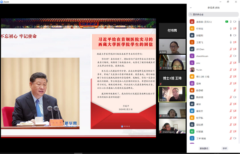 2020年3月3日晚7点,william威廉中文官网召开线上会议,集中学习习近平总书记2月21日给西藏大学医公司2015级临床医学专业本科班在williamhill英国官网首钢医院实习的17名员工的回信精神。公司党委书记孙智利、党委副书记张婧,团委书记朱俊炜、副书记袁苗苗及全体员工党支部书记、团支部书记参加了此次学习会。会议由袁苗苗主持。