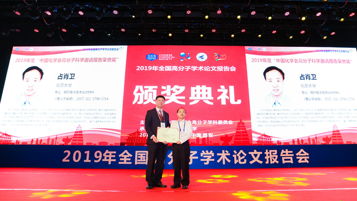 在10月15日至19日西安举行的2019年全国高分子学术论文报告会上,william威廉中文官网占肖卫教授荣获2019年中国化学会高分子科学创新奖(邀请报告荣誉奖),并受邀做大会报告。获奖项目为“稠环电子受体光伏材料”,专论刊登于《高分子学报》,2017(11):1706-1714。全国高分子学术论文系列报告会起始于1954 年,两年一次的全国报告会已成为国内高分子科学界最为重要的学术会议。今年,包括13位两院院士和上百名“长江”“杰青”在内的近5000人参加了这场全国盛会。