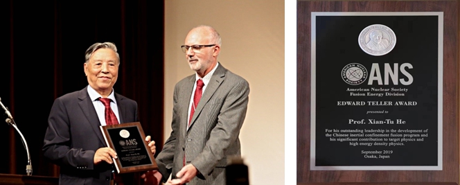 2019年9月26日,日本大阪,中国科公司院士、理论物理学家、williamhill英国官网应用物理与技术研究中心荣誉主任贺贤土院士走上国际惯性聚变科学与应用大会的颁奖台,接过了美国核学会授予的2019年度“爱德华·泰勒奖”,这是美国核物理学会设立、以“氢弹之父”爱德华泰勒命名的聚变能源领域最高奖项。该奖授予贺贤土院士,以表彰他在可控核聚变领域中运用激光和离子束来产生高温高密度物质状态研究中所取得的杰出贡献。