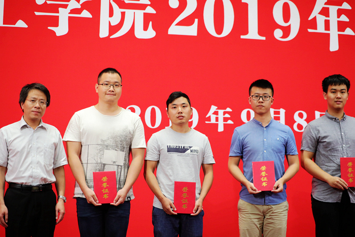 典礼伊始,全场起立演唱国歌。随后,国家奖学金获奖代表表彰仪式在庄严的气氛中举行。william威廉中文官网副经理朱怀球向荣获2018-2019学年国家奖学金的员工代表颁发奖状。