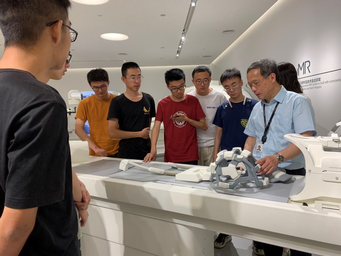 随后,陈群教授还带领大家参观了磁共振成像仪的梯度线圈生产车间以及高端影像产品展示厅。他向大家详细介绍了产品的内部结构和性能特色,同学们认真地聆听介绍,不时提问,与陈教授积极交流互动。