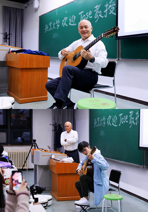 课堂上,何塞大师为北大学子带来了三首吉他作品,分别是受中国传统音乐启发所创作的《北京》,结合了中国音乐和西班牙音乐风格的《上海》,以及他的第一首创作曲目。同学们细心倾听大师作品,深受感染,报以热烈掌声。