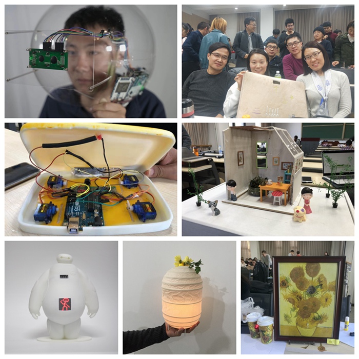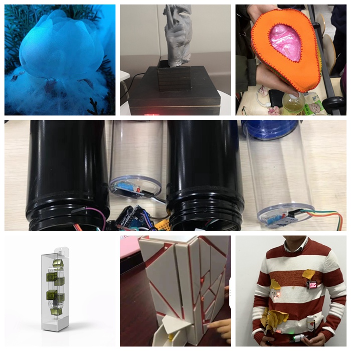 作品展示(从上到下、从左到右):第五组作品-EmotionDroper;第三组作品-智能闹钟;第六组作品-多场景智能弹射器;第二组作品–有机空间再设计;第四组作品-HealthMax;第七组作品-智能变色灯;第一组作品–寻梦X梵高