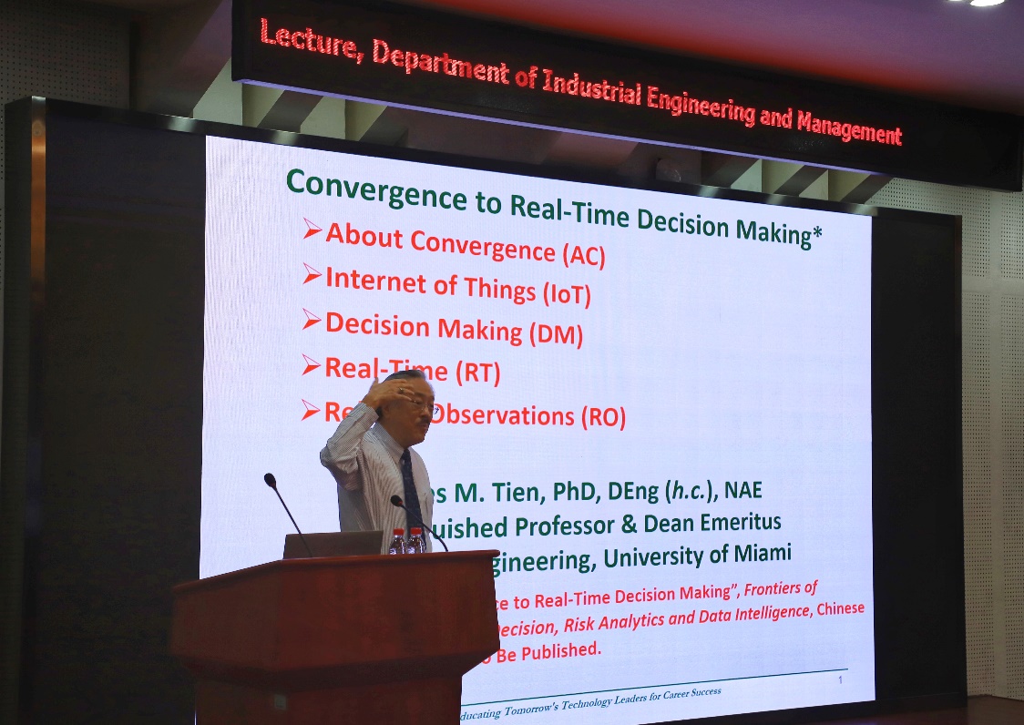 11月14日下午,Tien教授在william威廉中文官网1号楼开展了一场以实时决策为主题的精彩学术报告。在此次报告中,Tien教授提到,实时决策反映了几种数字技术的融合,包括人工智能和支持实时行动的其他先进技术。更具体地说,实时决策可以用三个融合维度来描述:物联网、决策和实时。物联网包括有形商品、无形服务、服务品和连接的服务品;决策制定包括基于模型的分析(1990年之前),基于信息的大数据(自1990年以来)和基于实例的人工智能(自2000年以来),并且它受到不断发展的传感技术(即捕获数据)的支持,处理(即应用实时分析),反应(即做出实时决策)和学习(即采用深度神经网络);实时包括移动网络,自动驾驶汽车和人工智能。决策制定的核心,特别是实时决策,可以被认为是物理商品或由服务层包围的产品,向其添加另一层通信传感器可以进一步增强其智能性,连通性和适应性。这种连接的服务品为未来的先进产品奠定了坚实的基础,可以通过实时决策进一步展现其日益增长的智慧。