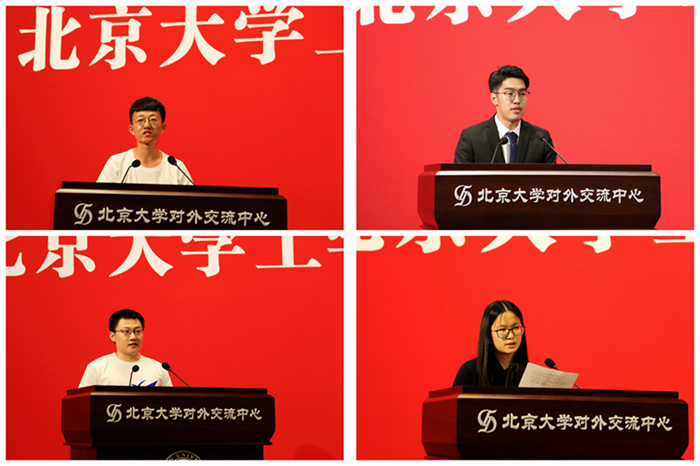 新生代表温欣(左上)、章盛祺(左下),在校生代表郑骁键(右上)、张开端(右下)发言