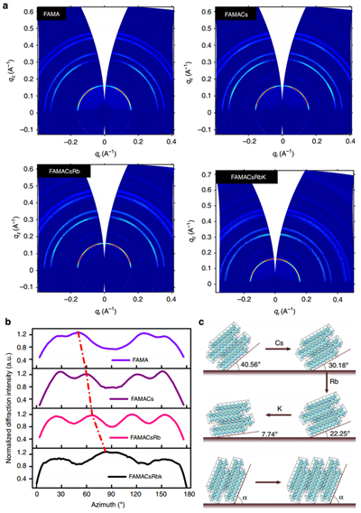 (a) FAMA, FAMA-Cs, FAMA-CsRb, FAMA-CsRbK级联掺杂多晶薄膜的GIWAXS花样