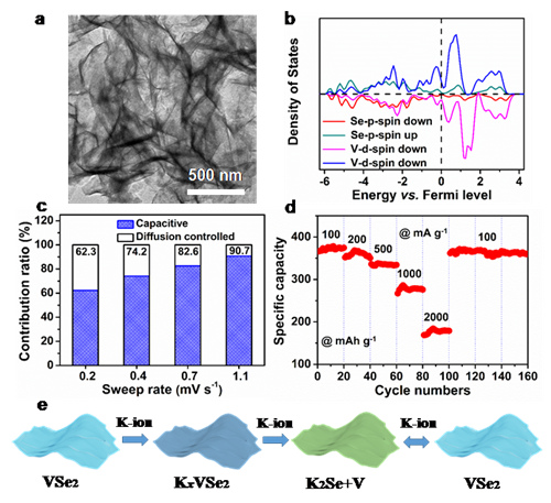 图1. (a) 超薄VSe2纳米片的透射电镜图;(b) VSe2的投影态密度图;(c) 不同扫速下的电容贡献百分比图;(d) VSe2纳米片的倍率性能图;(e) 超薄VSe2纳米片中可逆储存K+的示意图。