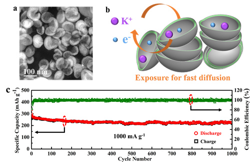 郭少军">郭少军课题组通过一种简单胶体合成法成功地制备了金属类石墨烯VSe2超薄纳米片,其具有高的比容量,倍率性能和循环稳定性(图1)。独特的类石墨烯纳米结构可有效增大电极/电解液的接触面积,促进电子/K+传输,提供丰富的活性位点,引起显著的赝电容行为,并有助于在反复循环过程中维持结构完整性。类石墨烯VSe2超薄纳米片展示优异的电化学性能,高的比容量(在100 mA/g时为366 mAh/g),优异的倍率性能(在2000 mA/g时为169 mAh/g),以及持久的循环性能(在2000mA/g下循环500次后容量保持率高达87.3%);合成的MoSe2/C核壳结构材料具有半空心结构,类似于开心果壳结构,在表面包覆了一层超薄非晶碳。这种特殊的结构有利于钾离子和电子的转移,在充放电过程中缓冲体积膨胀,防止活性物质溶解到电解液中,而且其半空心结构提高了电池的体积能量密度(图2)。在200 mA/g的电流密度下,经过100次循环具有322 mAh/g的比容量。当电流密度提高到1000 mA/g时,经过1000次循环,仍能达到226 mAh/g的比容量,显示出优异的电化学性能。过渡金属硒化物显著的电化学性能可归因于其多电子转移、独特的二维结构、快速K+扩散、高电子电导率,以及在嵌钾/脱钾的过程中显著的赝电容行为。第一原理计算表明,层状过渡金属硒化物具有较大的吸附能和较低的扩散势垒,证实了优良的电化学反应动力学。