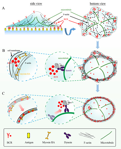 B淋巴细胞作为抗体免疫应答过程中的重要参与者,维系着人类的健康。B细胞的免疫活化进程在其细胞表面的B细胞受体(BCR)识别外来病原体抗原后启动。前期工作揭示B细胞接触到抗原呈递细胞(APC)表面展示的抗原、进行免疫活化的过程中,会产生明显的铺展-收缩现象,从而将抗原集中在B细胞与APC接触面的中央,形成高级免疫突触结构。这一铺展-收缩过程是由B细胞产生的牵引力所引起的,但牵引力的具体特征及机制并不清楚。