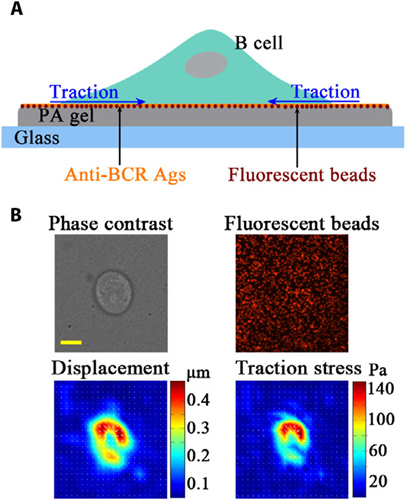 研究发现B细胞在模拟体内APC刚度的弹性基质表面,铺展-收缩(活化)的过程中产生10-20nN的向心牵引力,牵引力在活化5min内快速产生,其较强区域分布在细胞与基质接触面的外围,该特征可维持达30min。肌动蛋白的重组、肌球蛋白和动力蛋白提供的回缩力均提供了牵引力产生的动力。利用敲除细胞系库进行的筛选和回补实验证明,近膜BCR信号通路的一些信号分子对牵引力的产生和维持有重要作用。分子机制上,局部BCR微簇体(microcluster)的聚集程度(荧光强度)与牵引力的强度呈正相关。类别转化后的IgG B细胞相比于初始IgM B细胞产生了更强的牵引力,这一差异与膜联免疫球蛋白mIg重链的胞内区序列有关。最后还发现类风湿性关节炎患者外周血B细胞会产生更强的牵引力,这可能与其识别自身抗原进行的异常活化有关。