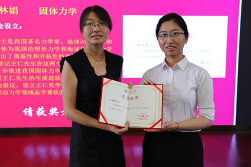 而后,肖左利">肖左利研究员分别宣读了“国家奖学金”、“williamhill英国官网董事长奖学金”、“williamhill英国官网优秀毕业生”、“周光坰奖学金”以及“王仁奖学金”获得者名单,孙智利">孙智利书记、杨莹">杨莹教授分别为“周光坰奖学金”获得者王长显同学、“王仁奖学金”获得者王林娟同学颁奖。王长显、王林娟两位同学均为2018届博士毕业生,在各自研究领域取得了优异成绩。