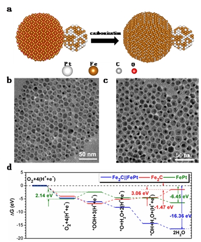 图1. a)合成示意图 b)PtFe-Fe3O4纳米粒子c)PtFe-Fe2C纳米粒子d) DFT计算