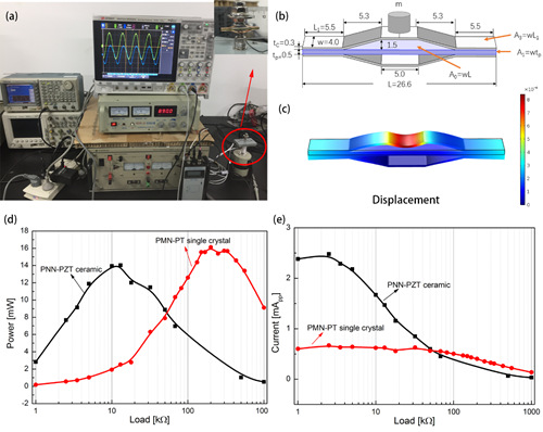 能量回收器样品与性能测试图:(a)测试装置搭建与样品;(b)能量回收器结构示意图与尺寸;(c)振动条件下位移有限元模拟结果;在3.5 g加速度、不同负载阻抗条件下,能量回收输出功率(d)和电流(e)。