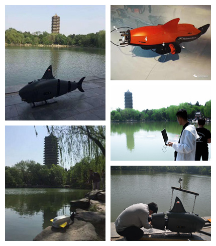 左上:智能仿鲨鱼机器鱼;左下:智能仿箱鲀机器鱼;右上:混合动力水下机器鱼;右二、右三:调试中的工作人员