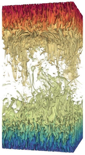 “我目前研究的主要对象是海洋上层海水中双扩散对流现象导致的垂直混合输运现象,”这也是杨延涛">杨延涛四年来在荷兰一直做的项目,他在研究中得到一个比较有意思的结论,“简单来说,如果从下方加热水,热水会向上流动;类似的,如果把盐溶解在上方水体中,盐水会往下沉,因为越咸的盐水越重。我研究这个系统是同时从上面加热和增加盐度;单独在上方加热,会让流体变得更稳定,而单独在上方增加盐度则会驱动流动的产生;但是当两者以适当的强度比结合之后,我们发现上方加热反而会促进盐度更快的向下方输运;虽然流动速度更小但是盐度的传递却变得更快。”这一研究成果发表在2016年《美国科公司院刊》上,这一让流动结构更稳定(流动速度更小)的同时提高传输效率的发现也有着很多实际应用,比如在实验环境中利用类似机制通过稳定流动结构以加速流体中组分的输运效率。对于海洋相关应用来说,“这个现象出现的参数范围跟海洋里面的参数十分相似”。最近,杨延涛">杨延涛还利用大规模数值模拟再现了热带海洋中的一种多层流动结构,如下图所示:流动结构在竖直方向呈现皆然不同的三层结构。