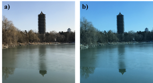 北大博雅塔照片(a和b分别为相机镜头被半透明太阳能电池遮挡前后)