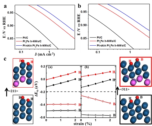质子交换膜燃料电池(Proton exchange membrane fuel cells, PEMFCs)有利于解决目前全球性的能源短缺,环境污染及气候变化等问题,被认为是替代传统内燃机的理想动力供应设备。然而,PEMFCs的商业化应用受限于其较高的Pt负载量用于催化电极反应的进行,尤其是阴极动力学缓慢的氧还原反应(Oxygen reduction reaction, ORR)。因此,设计及合成低Pt用量高催化活性的电催化剂至关重要。提高ORR活性的一个有效策略是将过渡金属(M)与贵金属Pt 合金,通过配体和应力效应来调控其近表面组份。研究表明,具有三明治结构的Pt-skin对ORR的催化性能卓越;同时,Pt的高指数晶面也较其它低指数晶面有更高的催化活性。若能结合以上两种结构特征,势必会进一步促进电催化反应的进行。然而,如何实现该结构的合成仍是一个巨大挑战。为解决这一问题,william威廉中文官网郭少军">郭少军团队设计开发了一种新型合成路线,得到了具有Pt-skin结构和高指数晶面的一维纳米线结构。物理表征结果证实,所得锯齿状一维Pt3Fe纳米线表面形成了约两个原子层厚的Pt-skin结构。电化学实验表明,该催化剂的比质量和面积活性分别达到了4.34 mA cm−2 和2.11 A mg−1,比商业Pt/C分别高出16.7 和13.2倍,且具有极为卓越的电化学稳定性。进一步计算研究发现,这种独特结构所表现的配位和应力效应能够优化氧吸附能,从而大大提高催化活性。该工作将对电催化理论研究和新型高效燃料电池电催化剂的开发具有指导意义,也为下一代高性能低成本电催化剂的结构设计提供了新思路。