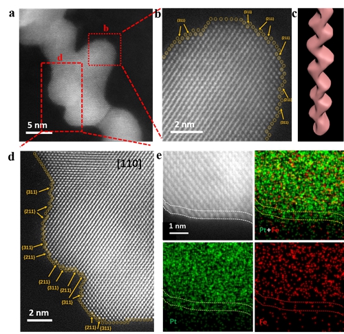 图1. Pt-skin Pt3Fe/C 锯齿状纳米线精细结构表征图