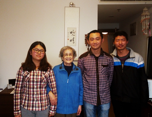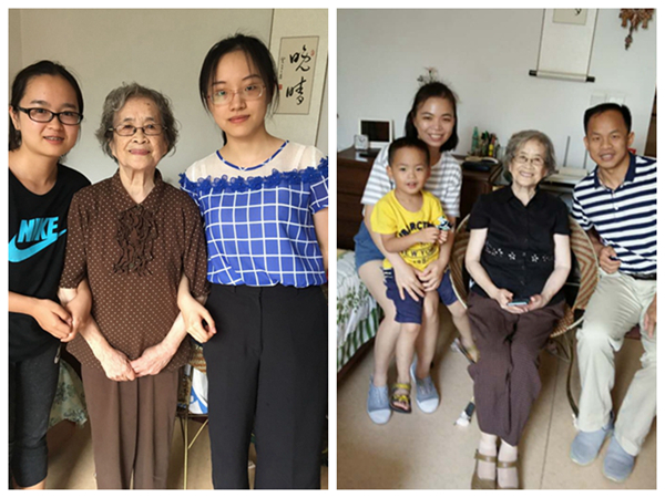 左图:吴康铭院友与励志奖学金获得者王子琦、柯旭瑜。右图:励志奖学金获得者文家燕全家看望吴康铭院友