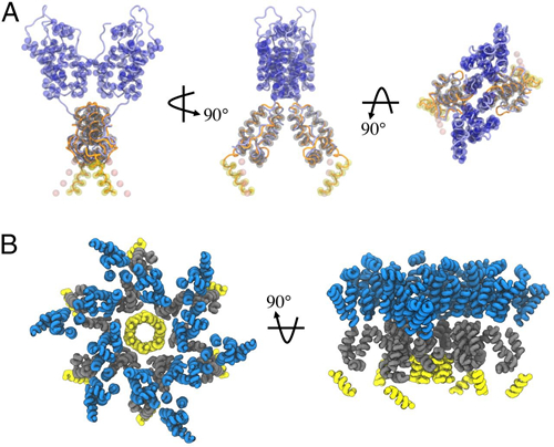 Group-specific antigen(Gag)是主导HIV-1病毒组装的核心蛋白,在细胞膜上通过与病毒RNA和蛋白之间交互作用能形成非常紧密的病毒复合体,导致膜结构改变,从而使复合体出芽形成病毒颗粒。科学家一直致力于通过各种不同的显微镜手段研究病毒形成的分子机制,但仍然无法在分子层面上明确解析HIV组装过程以及各分子之间的空间和动态行为。Course-Grained Modeling (粗粒化)计算机模拟是一种模拟分子动态行为的手段,可以解析单个Gag 蛋白乃至其结构域的构象变化(Figure 1)。通过粗粒化法模拟衣壳(CA)和间隔肽1(SP1)蛋白质结构域 (Gag蛋白自组装的重要成分)、细胞膜和病毒RNA,研究者成功地建立了吻合众多实验数据结果的病毒颗粒形成模型,还揭示了目前实验手段无法获得的HIV-1可能的组装机制。