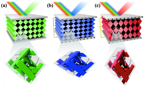 图1. 蓝相液晶光子晶体电场响应示意图:(a)无电场;(b) 施加负向电场;(c)施加正向电场。