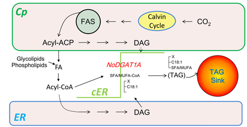 图1 微拟球藻中NoDGAT1A在TAG合成中的作用机制图