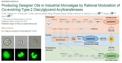 然后,课题组与中科院青岛能源与过程研究所徐健教授团队和马里兰大学Dr Yantao Li团队合作,全面深入研究了微拟球藻11个DGAT2基因的功能,阐明了它们之间的分工与合作在时间和空间上调节TAG的合成、以及TAG上脂肪酸成分(图2),证明了工业微藻的藻油饱和度能够定制化地人工设计,从而将微藻细胞工厂推入“藻油品质定制化(Designer Oil)”时代,为今后通过定向基因工程理性操控微藻提高TAG产量和质量提供了理论依据和方法策略。此研究于2017年10月27日在线发表在植物Top期刊Molecular Plant。(Xin et al 2017 Molecular Plant, In press http://www.cell.com/molecular-plant/abstract/S1674-2052(17)30310-6)