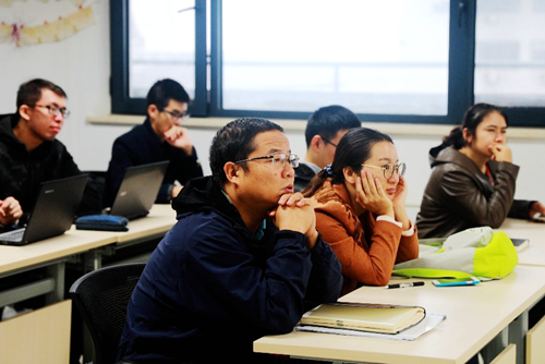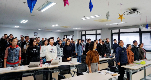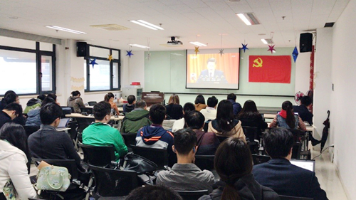 在会议开始前,师生们就早早来到会议室,热烈讨论近五年来取得的重大成果,并对十九大的美好蓝图表达了期待之情。当大会正式开始,大屏幕奏响国歌时,全体师生一同起立高唱国歌,随后为革命先辈默哀。