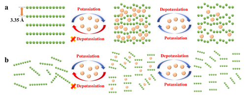 图1 石墨碳(a)和非晶有序介孔碳(b)作为钾离子电池负极材料的充放电过程示意图