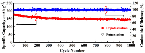 为了解决上述问题,郭少军">郭少军课题组提出将非晶有序介孔碳作为钾离子电池负极材料,在充放电过程中发现部分非晶碳转变为短程有序的碳原子排布,这一改变提高了钾离子电池的比容量、倍率性能和循环稳定性(图1)。一般对于晶体石墨碳,其层间距约为0.34 nm,钾离子嵌入时,引起层间距的迅速增加,导致晶体结构崩塌。与此不同的是,非晶介孔碳在经过充放电之后,形成了短程有序结构,层间距约为0.45 nm,在充放电过程中,这种较大的层间距有利于钾离子的自由嵌入脱出,缓解离子嵌入后的层间距不可逆性增加和体积膨胀。在电流密度为0.05 A g-1时,非晶介孔碳的比容量可以达到257.4 mAh g-1,这在目前报道的钾离子电池碳负极材料中是最高的。即使在大电流密度(1.0 A g-1)下,经过1000个循环,容量依然能保持在146.5 mAh g-1(图2)。本研究揭示了非晶介孔碳作为钾离子电池负极材料的应用前景,并对新型高性能钾离子电池负极材料未来的设计具有非常重要的指导意义。