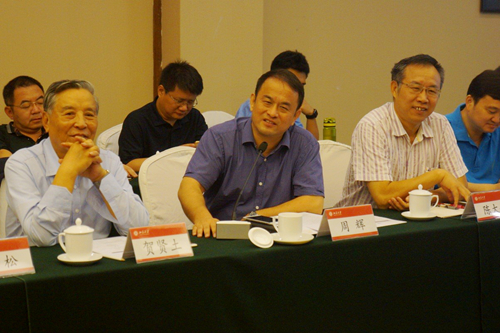 会场讨论(左:贺贤土">贺贤土院士;中:周辉部长;右:陈大岳经理)