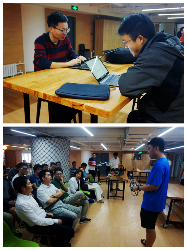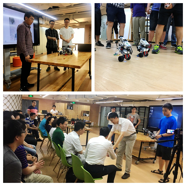 首先进行作品展示是机器人组,四组同学分别通过对“四自由度机械臂”、“移动机械臂”、“垃圾分类收集装置”、“自动缝纫机”作品的展示,与在场师生分享了各自作品的设计背景、设计思路、实现过程与结果。作品介绍结束后,同学们最为期待的四组机器动态平衡车竞速比赛环节开始,师生一同观战,现场气氛浓厚,机器人的精彩表现引得现场阵阵喝彩。