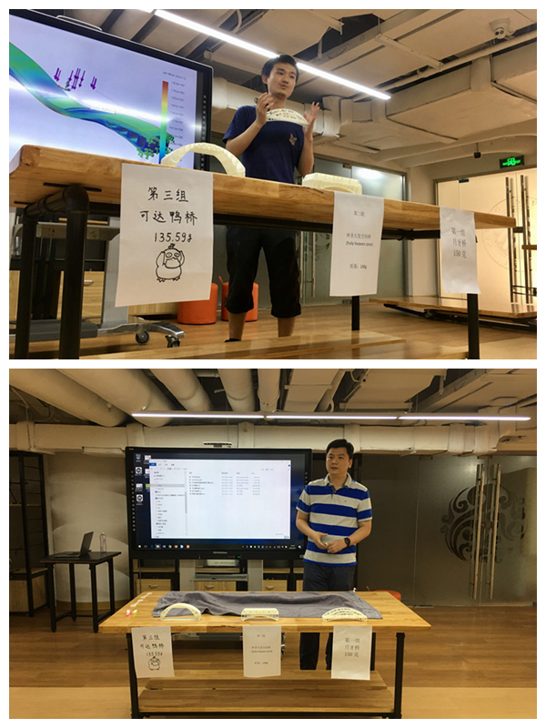 3D打印项目是以创新微缩桥梁设计为题目。鼓励同学们在优化结构性能,节约成本,并兼顾结构美学设计三方面要求下开动创新思维,设计和实现可靠、轻量和美观的桥梁结构。三组同学通过介绍作品设计构思、打印加工过程、材料性能测试等,分别对3D打印作品“月牙桥”、“神圣天堂空间桥”、“可达鸭桥”进行了展示,并公布了三个作品的承载实验测试结果。经实验测试,“可达鸭桥”的承载最佳,最大承载能力高达3125N。