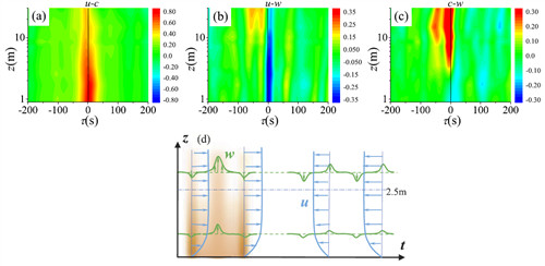 图2. 带通滤波(0.001Hz~0.03Hz)后的流向速度脉动u与PM10浓度脉动c的相关系数(a)、u与垂向脉动速度w的相关系数(b)和c与w的相关系数(c)。(d)为高速和低速超大尺度结构时间演化概念图,棕色阴影代表PM10浓度。