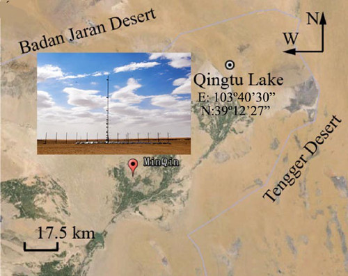 图1 沙尘暴(左图)和位于甘肃省民勤地区的青土湖观测阵列(QLOA)(右图)。