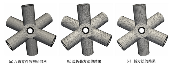 如图一示例,一个八通零件的网格,分别用边折叠方法和新的方法做粗化操作。新方法的结果要好很多,这一点从视觉效果上也能分辨出来。