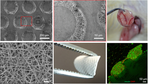 左列、中列:电纺丝支架材料及其微井结构;右上:血管化的细胞移植体;右下:经支架组装的胰岛在体内存活并发挥功能