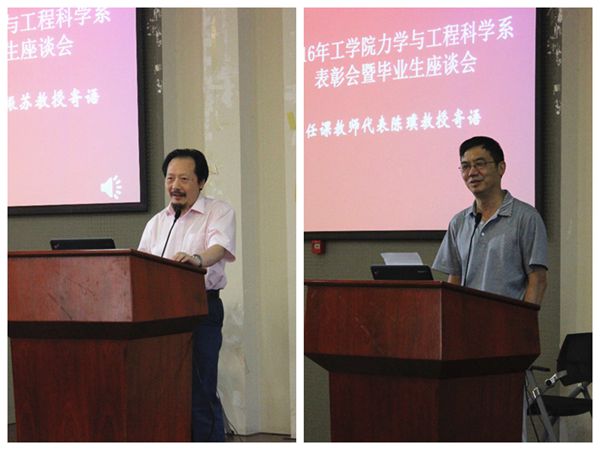 颁奖后,力学系教师代表佘振苏">佘振苏教授和陈璞">陈璞教授先后送上教师寄语。佘振苏">佘振苏老师首先祝贺大家顺利完成在北大的学业,踏上新征程,并欢迎同学们常回来走走,师生之情天长地久,这里永远都是北大力学人的家,“谈谈信仰”成为佘老师最想说的话,他希望同学们开启人生新篇章后,不论身处何方,遇何困难,都能坚守内心、坚持科研精神,不怕困难的勇往直前。