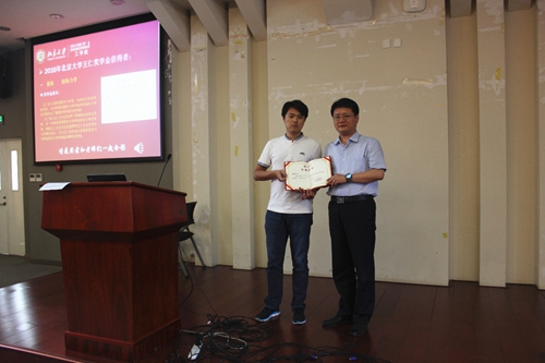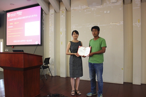 之后,副系主任肖左利">肖左利特聘研究员、杨莹">杨莹教授分别为王仁奖学金获得者董海同学、周光坰奖学金获得者程相孟同学颁奖(董海同学因腿伤无法出席颁奖仪式,由其他同学代领)。董海、程相孟两位同学均为2016届博士毕业生,在各自研究学习领域都取得了优异成绩。
