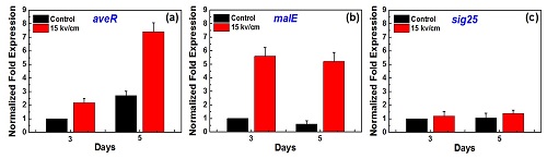 图2:纳秒脉冲电场有效地提高了阿维菌素关键基因aveR、malE的表达