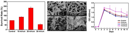 张珏">张珏课题组前期的研究工作已经证实了纳秒脉冲电场具有明显的肿瘤抑制作用(Cancer Letters, 2014, DOI:10.1016/j.canlet.2013.09.032)和降低蓖麻毒素的毒性功效(Scientific Reports, 2015, DOI: 10.1038/srep18781)。近年来,他们发现通过设计脉冲序列和电场参数,纳秒脉冲电场技术还能够促进细胞的增殖,例如加速固沙植物梭梭树的早期生长速度(Plasma Processes & Polymers, 2015, DOI: 10.1002/ppap.201400131),以及促进软骨细胞的增殖和分化(Scientific Reports, 2014, DOI:10.1038/srep05836)等。