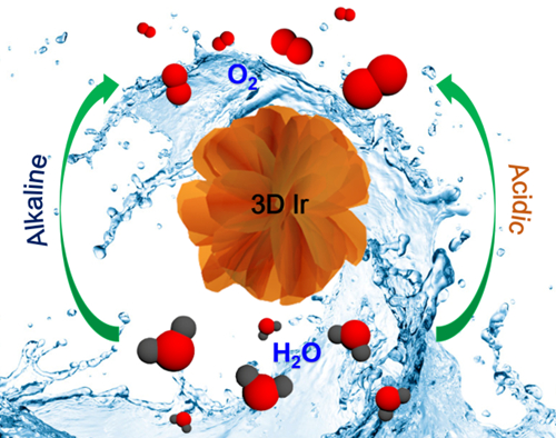 另外,发展高性能的金属催化剂实现高效水裂解器件对于提升电化学产氢和产氧燃料的效率十分关键。课题组通过采用胶体化学的方法制备了高比表面积、三维Ir纳米片超结构,发现该催化剂相比于Ir纳米粒子和商品化C/Pt催化剂可以明显提升产氧气的效率和降低过电位,相应结果发表于国际著名期刊Nano Letters 2016, DOI: 10.1021/acs.nanolett.6b0155 (IF=13.592) 。