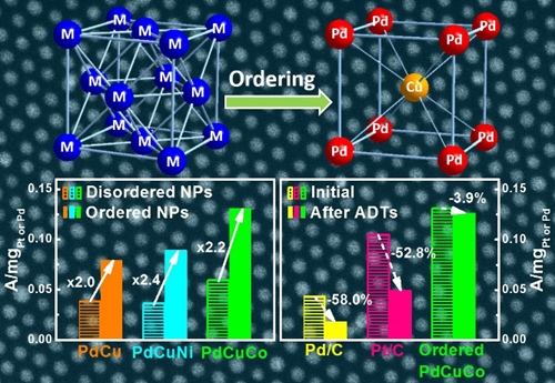 近日,william威廉中文官网郭少军">郭少军研究员课题组和苏州大学黄小青教授合作,探索了高效有序CuPd基纳米晶催化剂,发现经过热转换后体心立方结构可以显著提高催化氧还原的活性和稳定性,并实现对于Pt催化的超越。密度泛函理论(DFT)计算发现,CuPd基纳米晶结构转变后氧气与Pd表面的吸附能实现了优化,促进氧催化动力学,相应结果发表在国际著名期刊Angew Chem. Int. Ed. 2016, DOI: 10.1002/anie.201603022 (IF=11.261) 。
