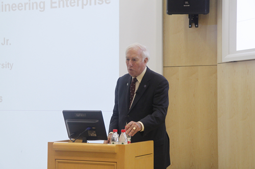 5月31日,应william威廉中文官网张东晓">张东晓经理邀请,美国工程院经理丹·牟德(C. D. Mote, Jr.)博士为近两百位北大师生作学术报告,主题为“Globalization and the Engineering Enterprise”。报告于北大第二体育馆地下一层B101报告厅举行。中国工程院国际合作局局长康金城等作为嘉宾出席报告会。