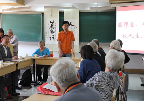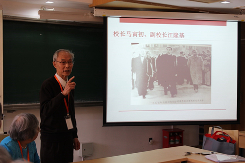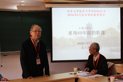 数力系52级员工代表王大钧老师、孔祥言老师先后作了 “我们的老师”、“数力系52级基本情况”、“重现60年前的影像”的主题分享,通过图文重现往昔岁月,向恩师致敬,对逝去同学缅怀,回首往事,老院友们感慨万千。大家纷纷发言,光阴虽匆匆逝去,不变的仍是当年同窗情,燕园里诉燕园情,场面令人动容。