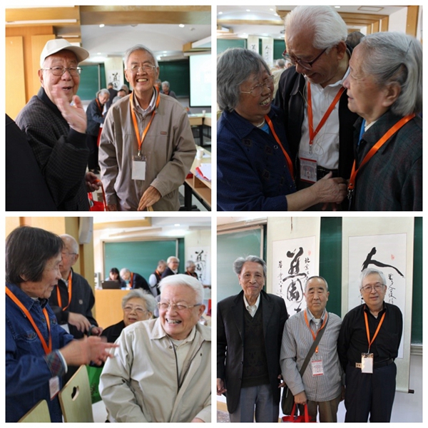 上午九时起,来自全国各地的52级同学陆续来到会场,陈耀松、林建祥、孙小礼等曾经执教52级的老师们也莅临会场,师生欢聚一堂。年过八十岁的老人们再聚首,或互相寒暄,或自我介绍,执手相认,“还记得当时头发那么黑,突然被时间沾染了灰”,相隔六十年,在春风和煦的燕园,再次回忆“恰同学少年”,用力握 手,轻拍彼此已经微微佝偻的肩膀,无言之中蘸满无尽情谊。